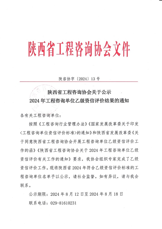 近日,陜西省工程咨詢協(xié)會(huì)發(fā)布《關(guān)于公示2024年工程咨詢單位乙級(jí)資信評(píng)價(jià)結(jié)果的通知》,我公司通過(guò)了陜西省2024年工程咨詢單位乙級(jí)資信評(píng)價(jià)。